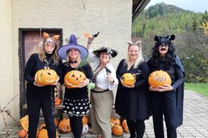 Letošní oslavy Halloweenu se náramně vydařily. V přístavbě se třídy navzájem předháněly ve výzdobě a žáci neváhali vyzdobit i okolí školy krásnými podzimními výrobky a dlabanými dýněmi.