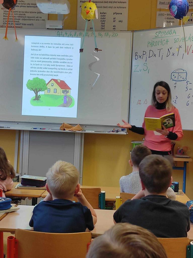 Ve středu 17. 4. nás v přístavbě navštívila paní spisovatelka Lenka Samcová a představila nám své knihy. Jednu z nich nám blíže představila - Nový kamarád/ka. Šlo o tzv. "gamebooky", na které se paní Samcová specializuje, a je to vlastně kniha psaná na míru, přímo pro jednotlivého čtenáře. To se dětem moc líbilo. Byly překvapené, že slyší příběh o svém spolužákovi a jeho nejlepším kamarádovi, že postavy z knihy znají, i jejich tajemství, přání, oblíbené hračky, jídlo, činnosti, atd.