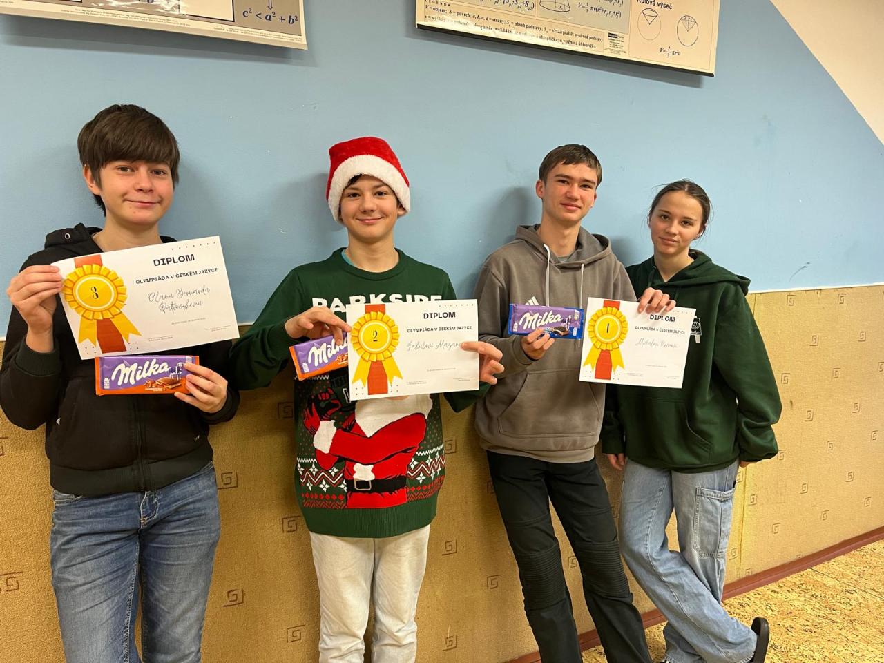 27. ledna vyrazili naši češtinářští olympionici do bojů v okresním kole. V Chomutově nás reprezenovali ti nejlepší ze školního kola - vítěz Michal Krčma z 9.třídy a Alan Bernard Patrovský z 8.třídy, který skončil sice až 3., ale zaskočil za nemocného Jakuba Mazance. Úkoly byly jako vždy těžké, Alanovi sedla více mluvnická část, Míšovi zase sloh, ale na stupínky vítězů jsme bohužel (zase) nedosáhli. Oběma klukům moc děkuji za reprezentaci školy