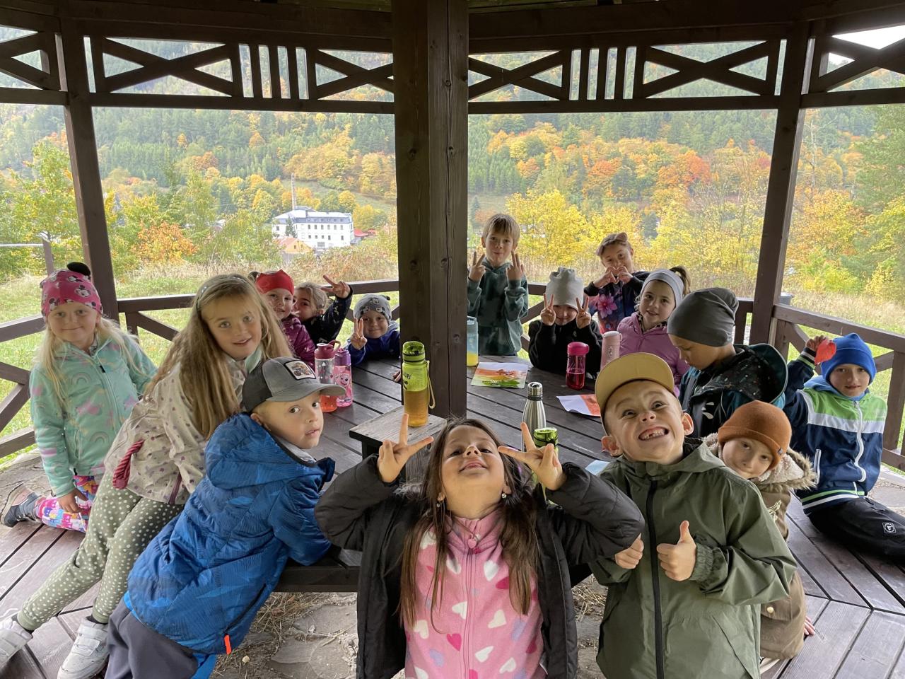 Dnes jsme s první třídou vyrazili ven na prvouku a děti měly možnost poznávat podzim zblízka. Rozdělili jsme se do pěti týmů po třech a každý tým dostal čtvrtku s třemi barvami. Podle těchto barev měly děti najít co nejvíce přírodnin a z nich pak vytvořit pana Podzima nebo paní Podzimku.