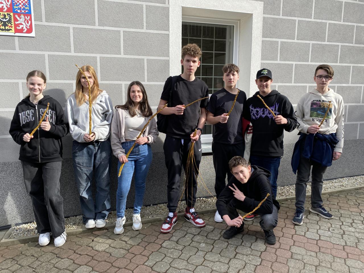 Poslední hodinu před velikonočními prázdninami se osmáci učili plést pomlázku, symbol znovuzrození, návratu tepla a jarního rašení. Jejich výtvory jsou v pondělí rozhodně použitelné, ale nové znalosti určitě využijí k upetení ještě hezčí pomlázky