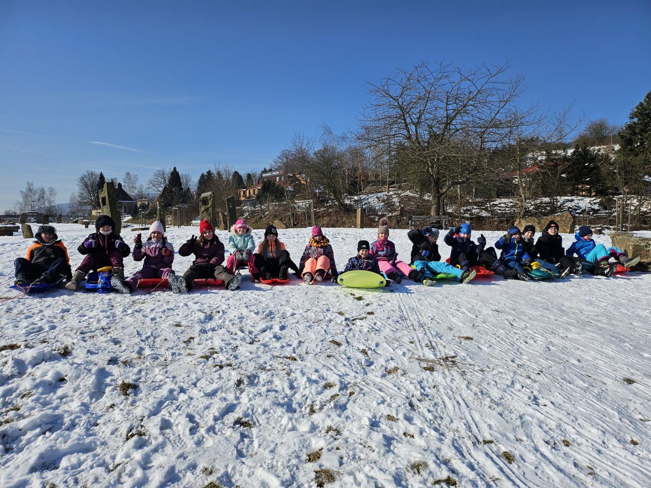 zasněženém svahu nedaleko školy. S velkým nadšením jsme za krásného slunečného počasí vyrazili bobovat. Děti od 1. až do 4. třídy se skvěle bavily, smích a radost naplnily vzduch, když se sjezdy na bobech střídaly s hrami ve sněhu. Bylo to skvělé dopoledne plné pohybu a zábavy!