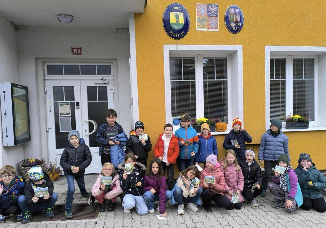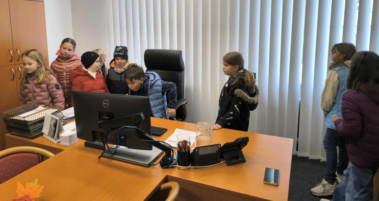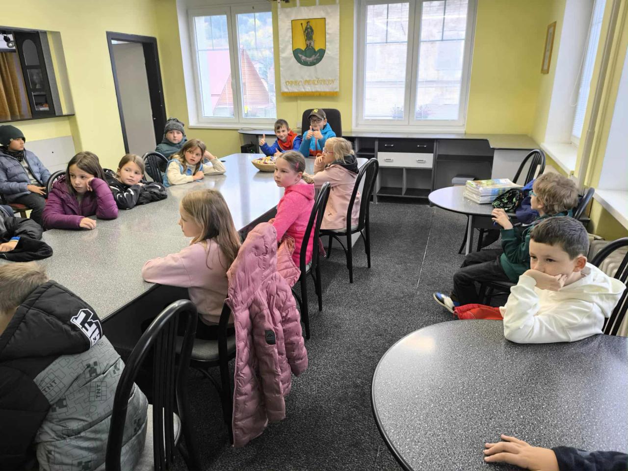 V pondělí jsme měli zajímavou hodinu prvouky - protože se učíme o obci, byli jsme za panem starostou. Ten nás provedl po úřadě, seznámil se všemi zaměstnanci a zajímavě vyprávěl o práci v obci, například za co jsme dostali fialovou stuhu. Také jsme si vyzkoušeli, jak se sedí v jeho křesle, třeba je někdo budoucí starosta