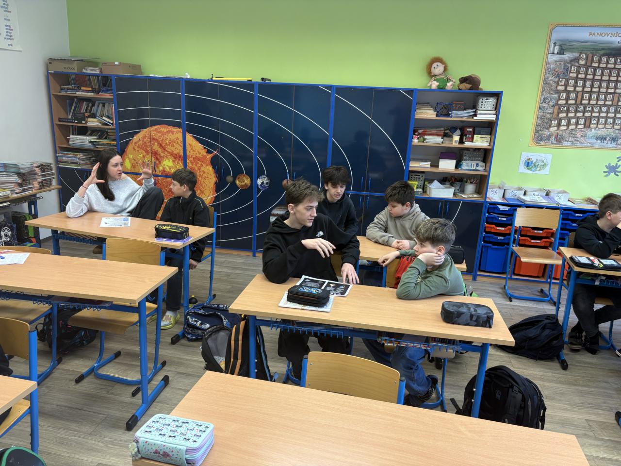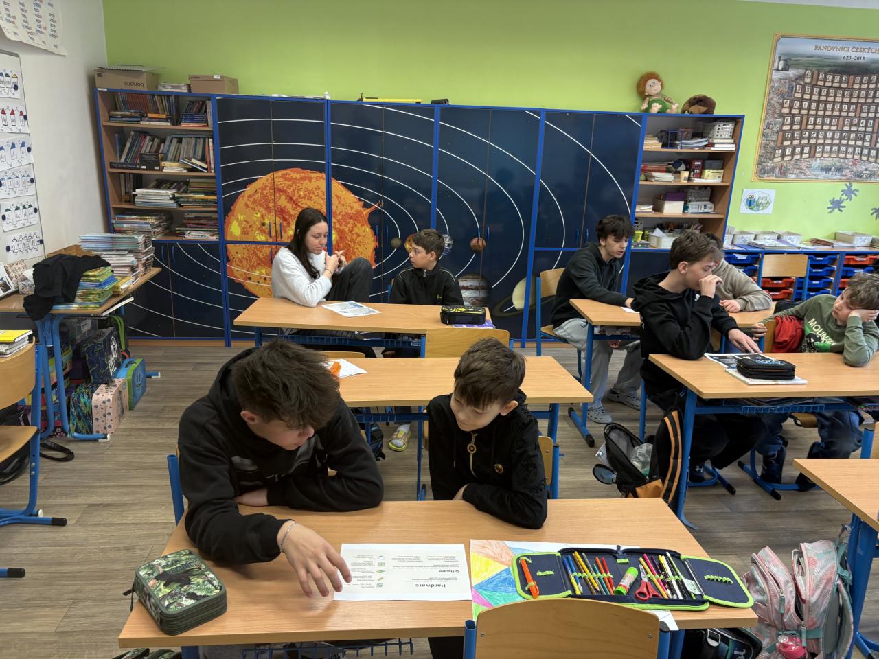Devátá třída si vyzkoušela roli mentorů pro žáky ze čtvrté třídy. Společně pracovali ve skupinách, kde deváťáci pomáhali mladším spolužákům pochopit základní pojmy z oblasti hardwaru a softwaru. Trpělivě vysvětlovali, odpovídali na otázky a vedli své skupiny k porozumění tématu. Na závěr si čtvrťáci své znalosti vyzkoušeli a všichni dopadli výborně – zaslouženě získali jedničku. Zpětná vazba byla velmi pozitivní, mentoři byli podle mladších žáků skvělí. Deváťáci si zároveň odnesli i vlastní zkušenost – uvědomili si, že práce učitele není vůbec jednoduchá a že by ji pravděpodobně nechtěl dělat každý.