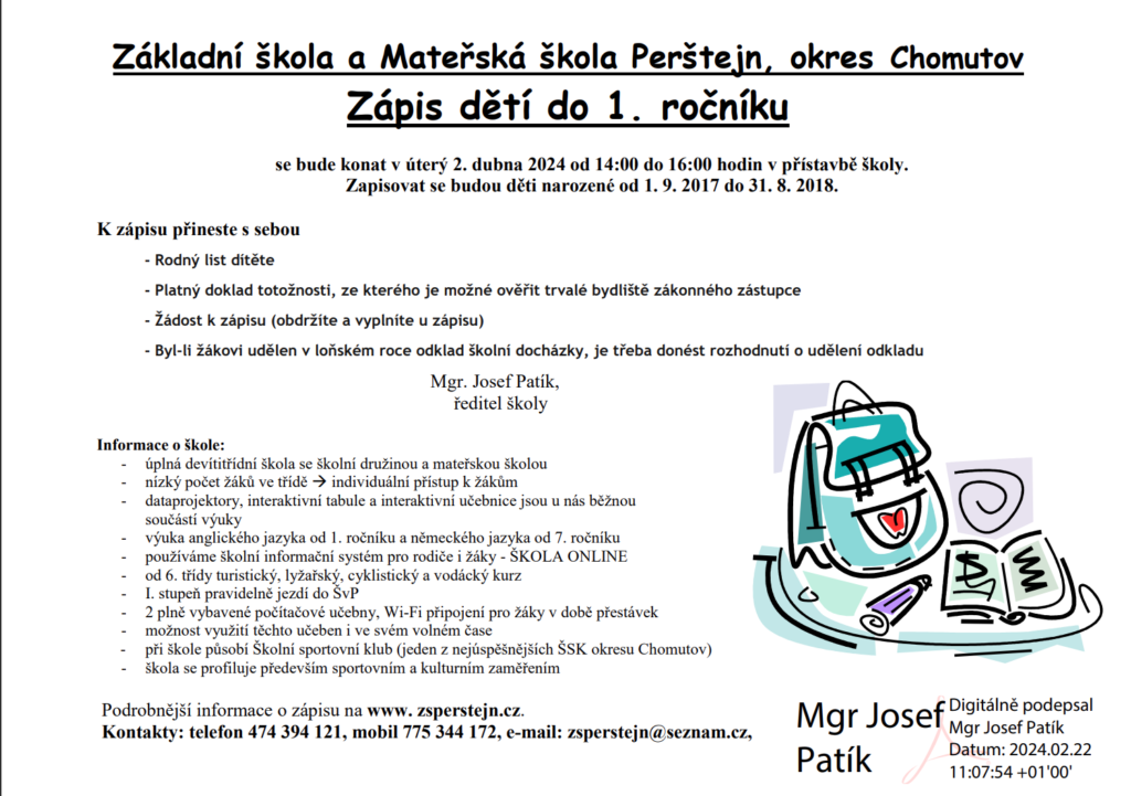 Na tomto odkazu se můžete přihlásit k zápisu do 1. třídy 2026: https://aplikace.skolaonline.cz/SOL/PublicWeb/57/KWE015_Prihlaska.aspx?ID=803